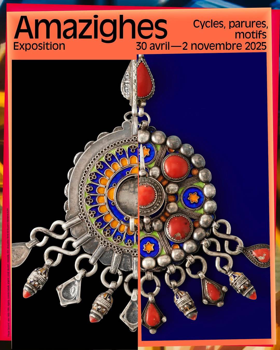 Du 30 avril au 2 novembre 2025, le Mucem propose une exposition majeure dédiée au monde amazigh, riche d’une histoire millénaire s’étendant de l’Égypte aux îles Canaries. « Amazighes – Cycles, parures, motifs » invite à découvrir près de 150 objets et œuvres, mêlant bijoux, textiles, céramiques, sculptures et archives, issus des collections prestigieuses du musée Pierre Bergé des arts berbères et du Mucem, ainsi que d’autres institutions publiques et privées.